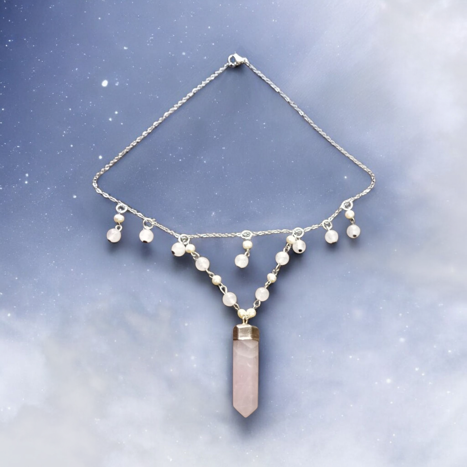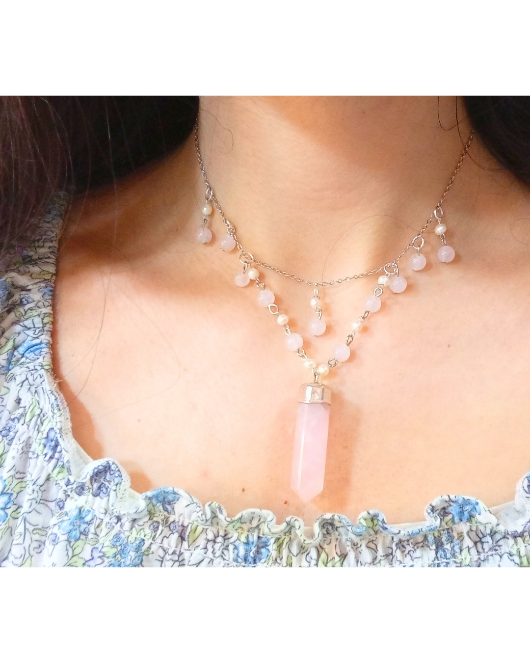 Rose quartz with natural pearl beads. Gentleness, purity, and love. Handmade with love 🫶